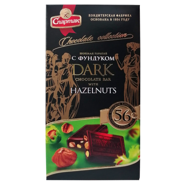 Wonderful combination between fine dark chocolate and crunchy hazelnuts is sure to delight any true chocolate lover. Cocoa content: 56%.