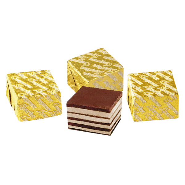 Unglazed candies with 9 alternating chocolate-nut and praline layers.