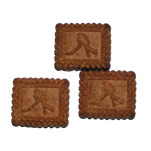 Patterned square biscuits made of wheat flour of prime quality. Sugar, whole milk powder, cocoa powder, and vanillin added.
