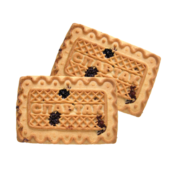 Patterned rectangular biscuits made of wheat flour of prime quality. Sugar, whole milk powder, raisins, and vanilla-cream flavour added.