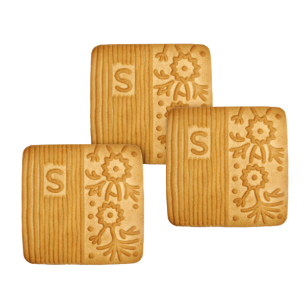 Patterned square biscuits made of wheat flour of prime quality. Sugar, condensed milk, and apple flavor added.