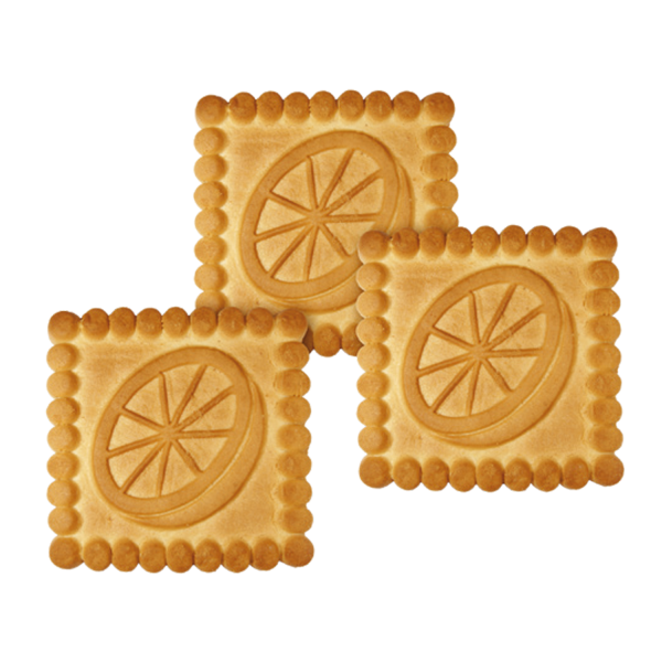 Patterned square biscuits made of wheat flour of prime quality. Sugar, vanilla powder, whole milk powder, and lemon essential oil added.
